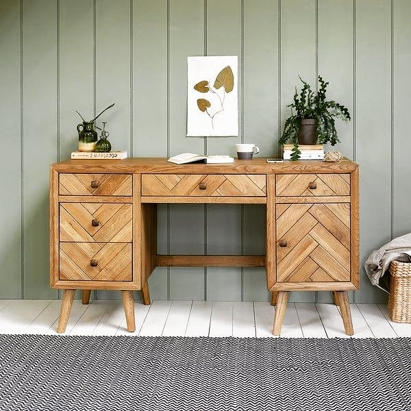 It has a textured brushed and glazed finish, and a mid-century modern look, with metal bronze coloured handles and slim oak legs. It’s a desk that’s which is bound to look good, every day.