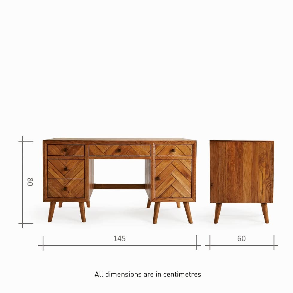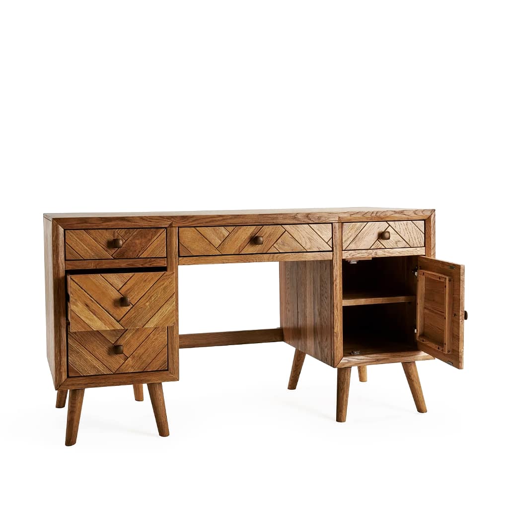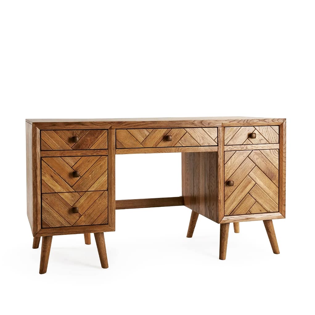 It has a textured brushed and glazed finish, and a mid-century modern look, with metal bronze coloured handles and slim oak legs. It’s a desk that’s which is bound to look good, every day.