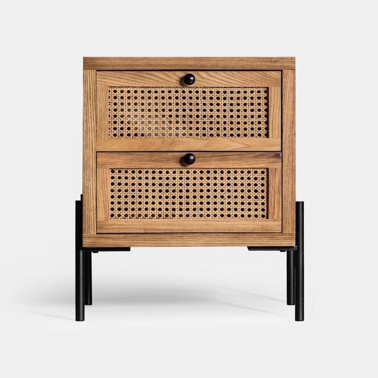 Add a natural soulful touch to your home with these two tier bedside table, made from solid acasia wood with a woven rattan front. Standing on four metal legs, it has two deep shelves, with a contrasting black metal polish which brings a pop of colour to the natural finish of wood.