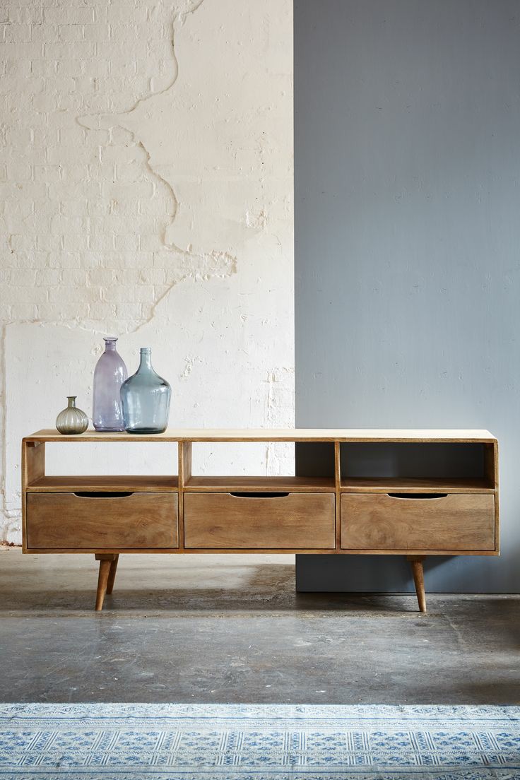 Wood legs and close wooden drawers lend an industrial edge to the MEDIA CONSOLE, which is crafted from solid wood. Three roomy drawers provide plenty of storage space for magzines, electronics and more.
