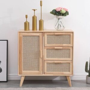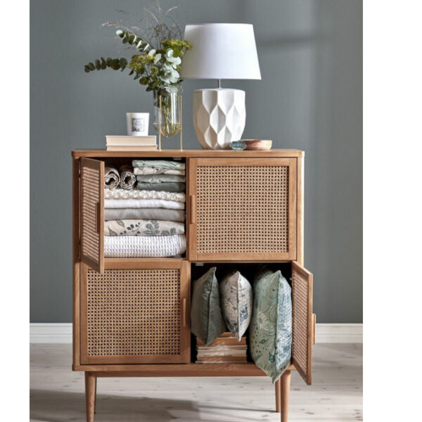 Characterized by the stunning natural rattan fronts and contrasting solid wood surround, our wicker storage unit brings a modern take on a retro design. Perfect for any contemporary or global styled home, this fully assembled furniture range is completed with straight wood legs, adding a touch of luxe styling.