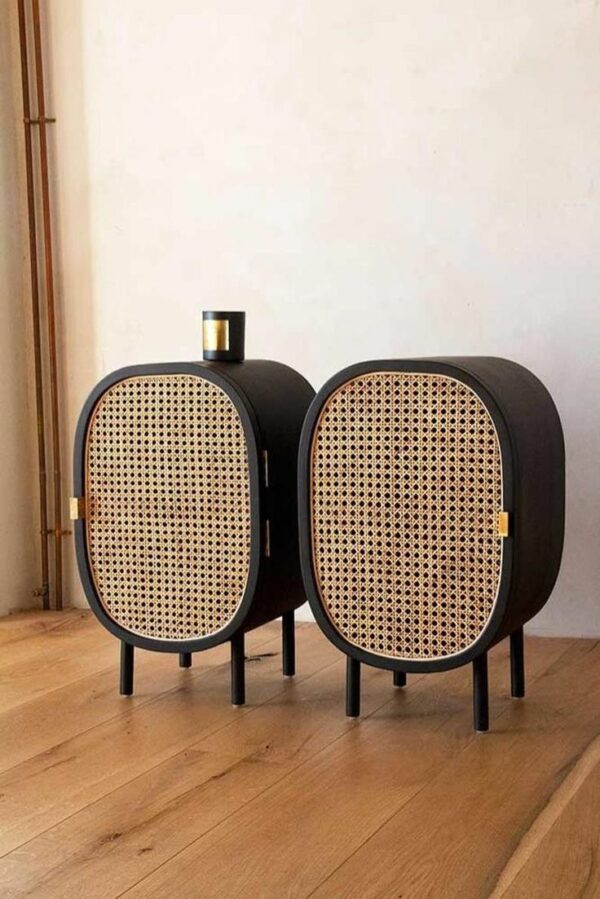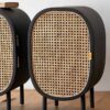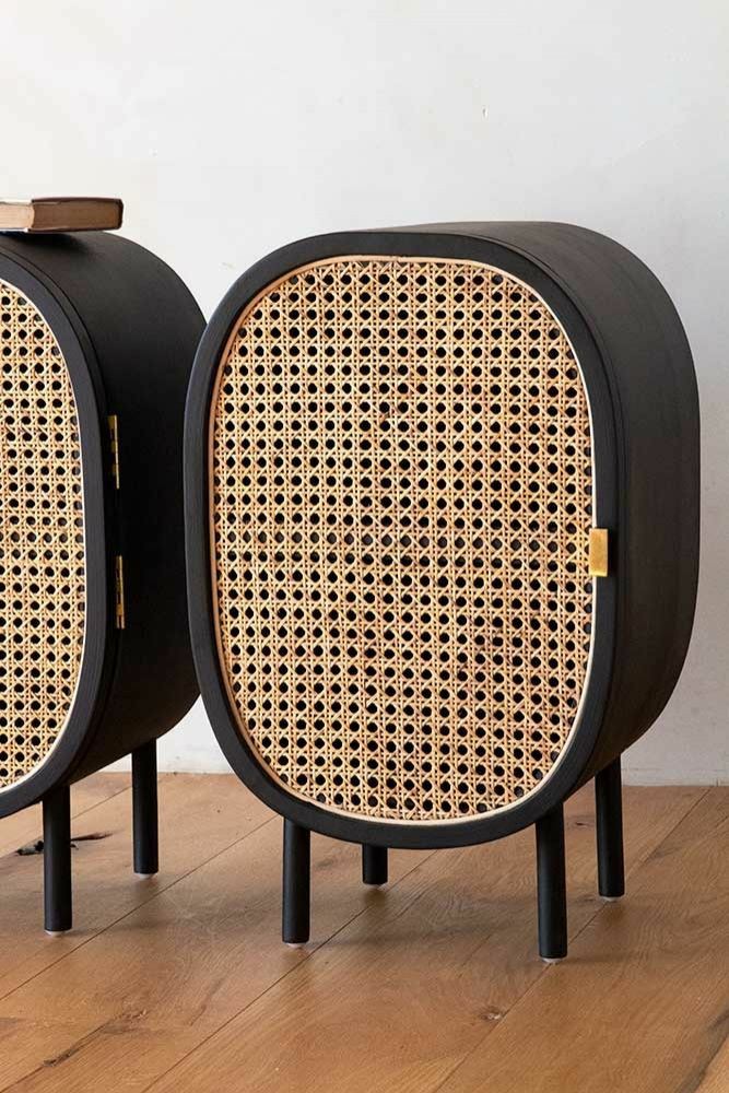 Add a natural soulful touch to your home with these two tier bedside table, made from solid acasia wood with a woven rattan front. Standing on four short legs, it has a curved shape with two deep shelves, with a contrasting black polish body that brings a pop of colour to the natural finish of wood.