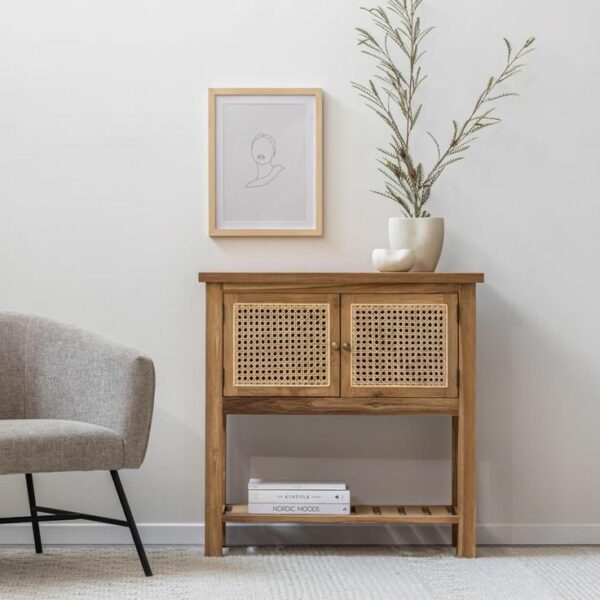 Stark rustic styling with plenty of surface and storage space combines in our CANNE CABINET CONSOLE TABLE.
