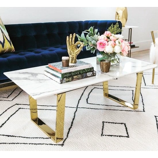 Its bracket-shaped legs are crafted from solid iron in brass gold finish, while the tabletop showcases a marble look with gray and white veining.