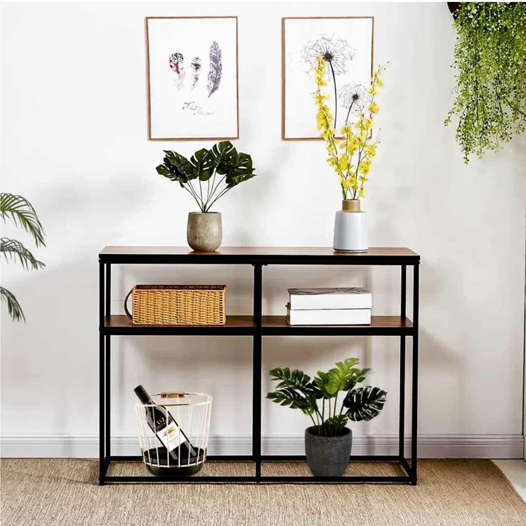 The Table has a simple geometric structure and has a combination of warm wood color surface and black metal frames. This shelf is designed for space saving and modern, stylish look. It can be placed in any room to provide additional storage space and aesthetic appeal to your home.