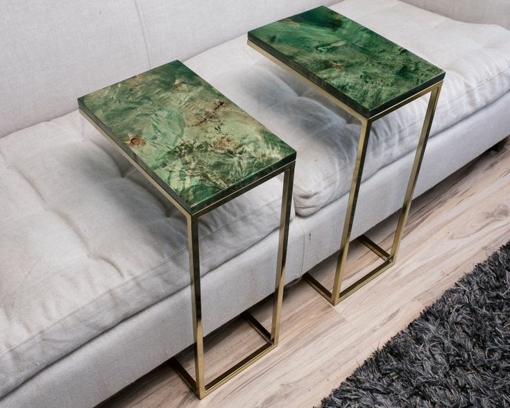 It features a cool and current two-tone contrast of silver metal and emerald marble. It’s crafted with a solid green marble top placed firmly on an angular iron base.