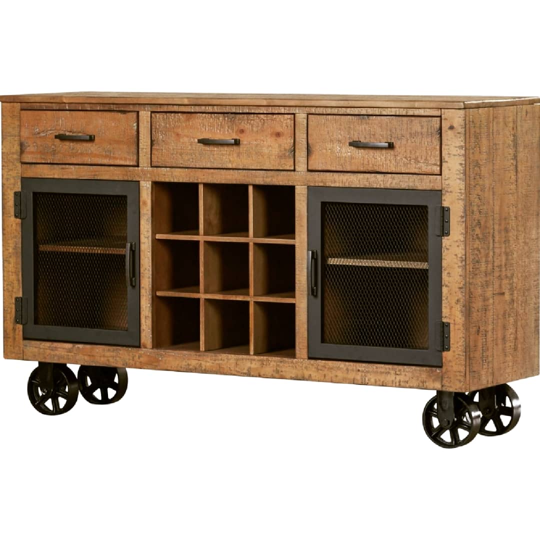 Three drawers hold utensils, while nine compartments provide wine storage. With two cabinets, you can easily corral plates, linens, and more.