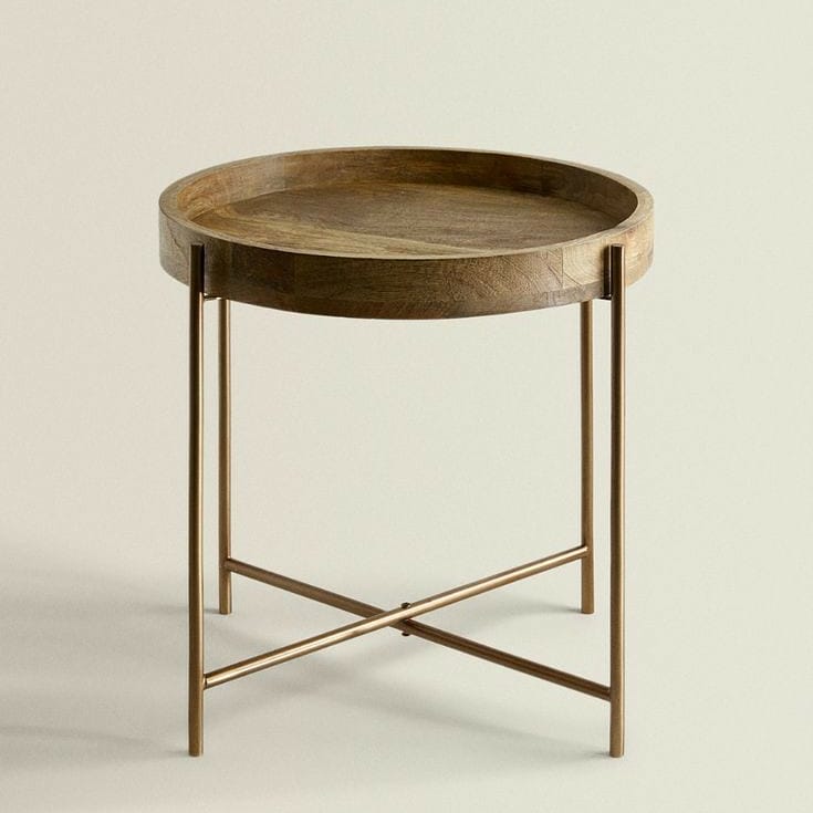 The gold frame metal tables features a cylindrical design with two open wood trays and 4 straight legs. The shelves have raised edges to help keep all of your stuff in place.