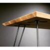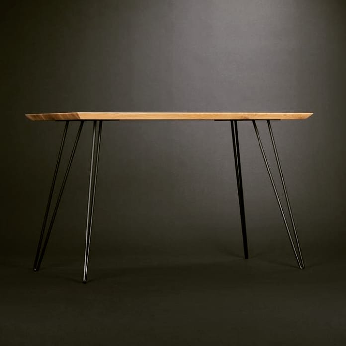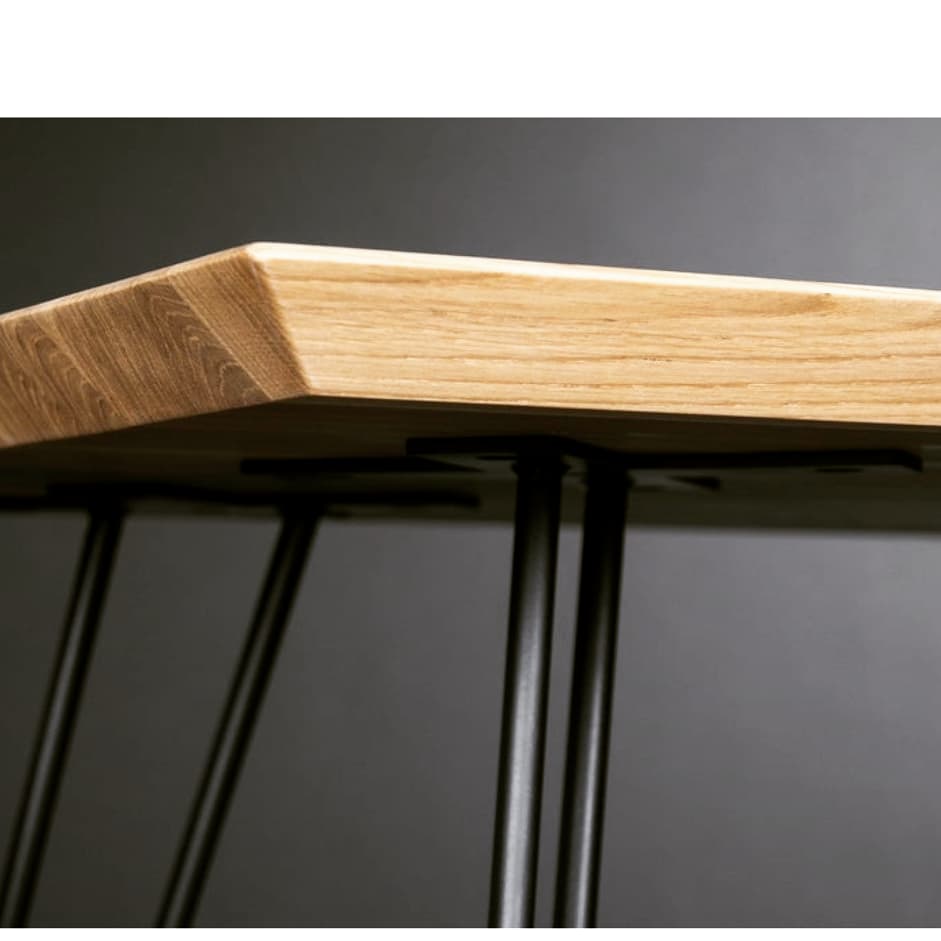Characteristic oak top, the edges of which are beveled at an angle of 45 degrees, have been settled on hairpin legs, made of a single piece of coated iron bar.