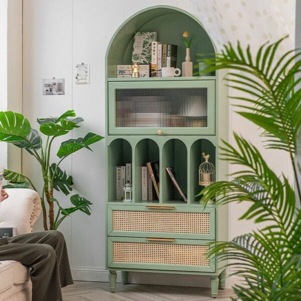 Its open frame measures a little over 72″ tall, so it’s sure to make a statement. This piece is crafted from solid wood with a gleaming canne finish and it showcases an arched top for some extra character.
