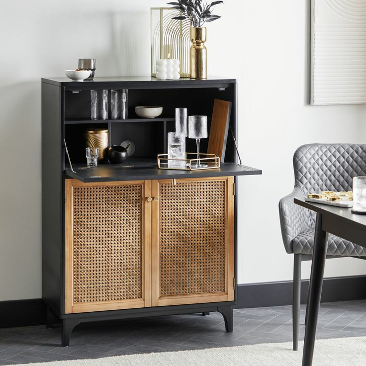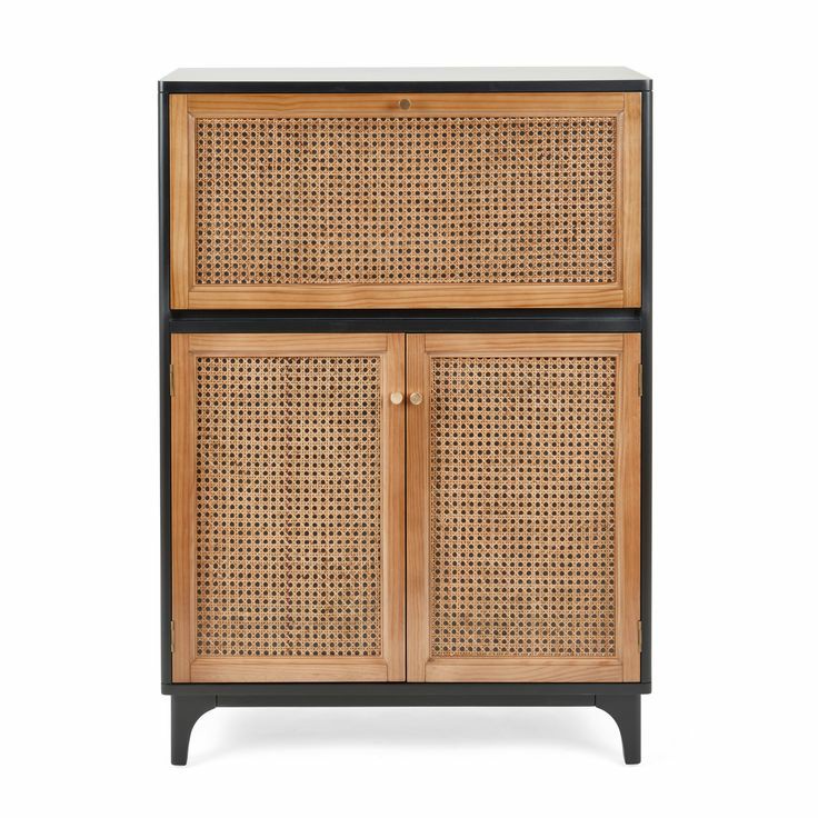 Whether serving up cocktails at your next weekend, get-together with family and friends, or looking to lend a modern touch to your living room look, this bar cabinet is here to help. Crafted from a blend of solid wood, it features four splayed legs and strikes a clean-lined silhouette. And with natural wood grain accents, it also brings a touch of rustic style.