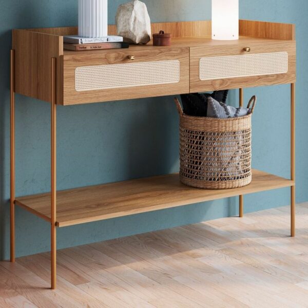 Stark rustic styling with plenty of surface and storage space combines in our WOODEN  WICKER DRAWER CONSOLE UNIT.