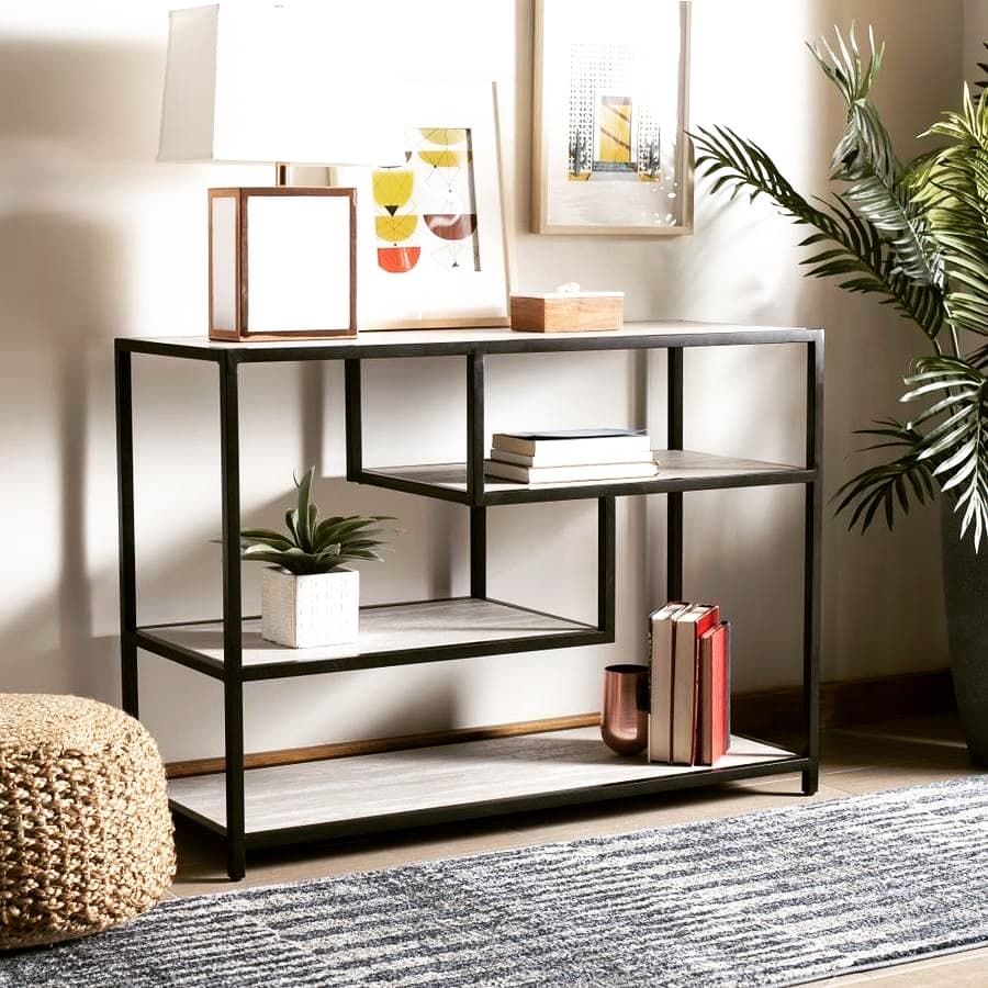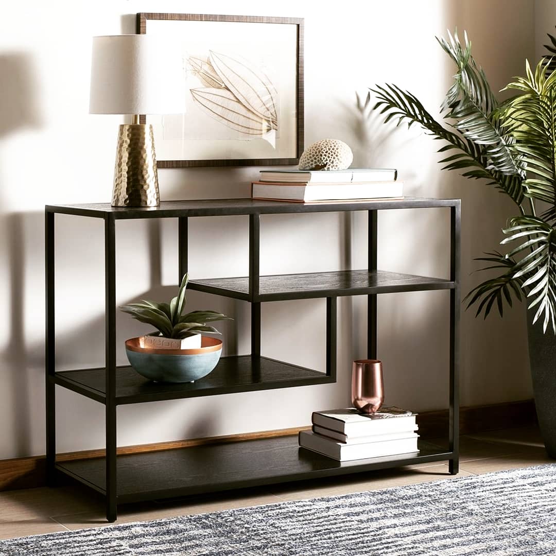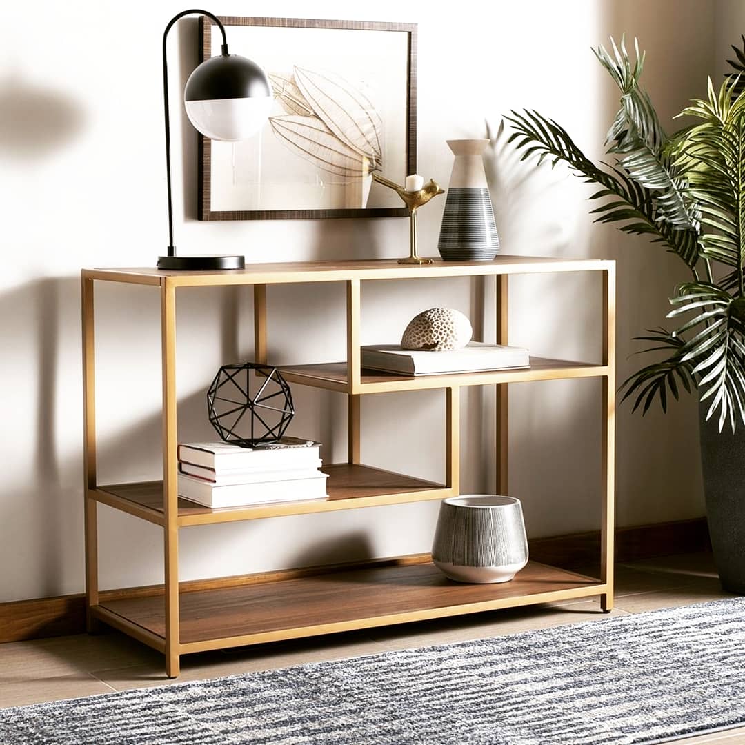 Inspired by bold modern art and architecture, this Geometric Console Table stores and displays objects with depth and dimension. Its walnut and gold finish highlights its clean lines and complements any living room décor.