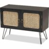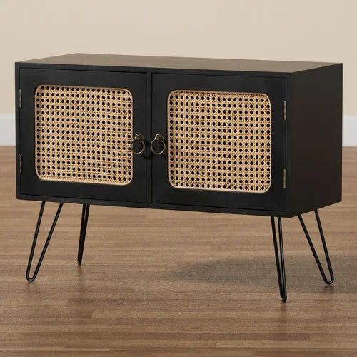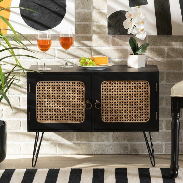 This handy piece is comprised of a sturdy wood frame supported by metal hairpin legs and adorned with rattan accents. Its wide tabletop serves as an excellent prep station while two large shelves behind the doors efficiently organize cookware and appliances.