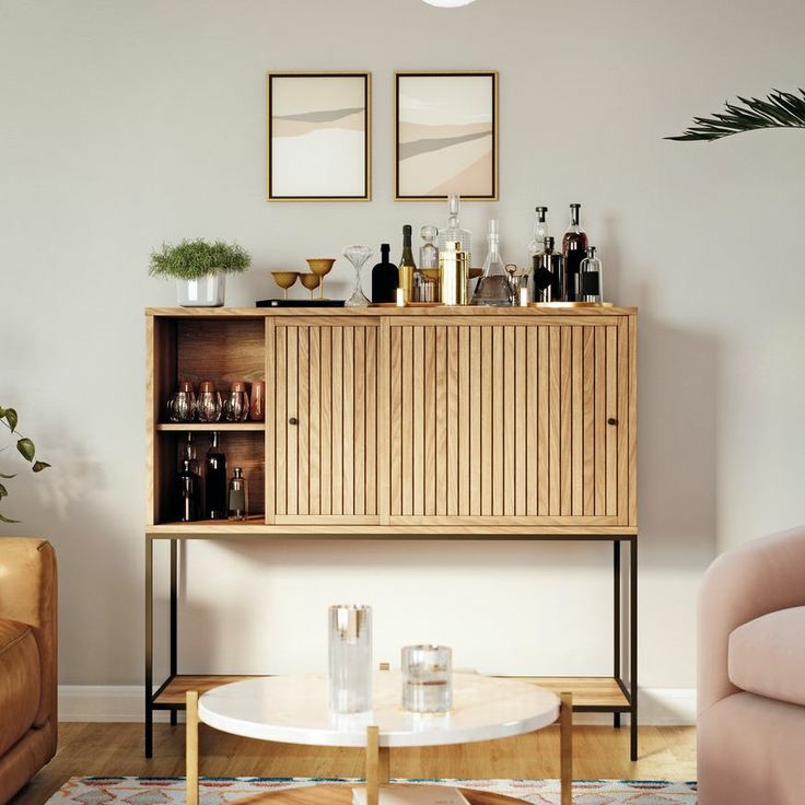 Whether serving up cocktails at your next weekend, get-together with family and friends, or looking to lend a modern touch to your living room look, this bar cabinet is here to help. Crafted from a blend of solid wood and metal, it features four splayed legs and strikes a clean-lined silhouette. And with natural wood grain accents, it also brings a touch of rustic style. The piece also has a lower wooden shelf for those extra handy items.