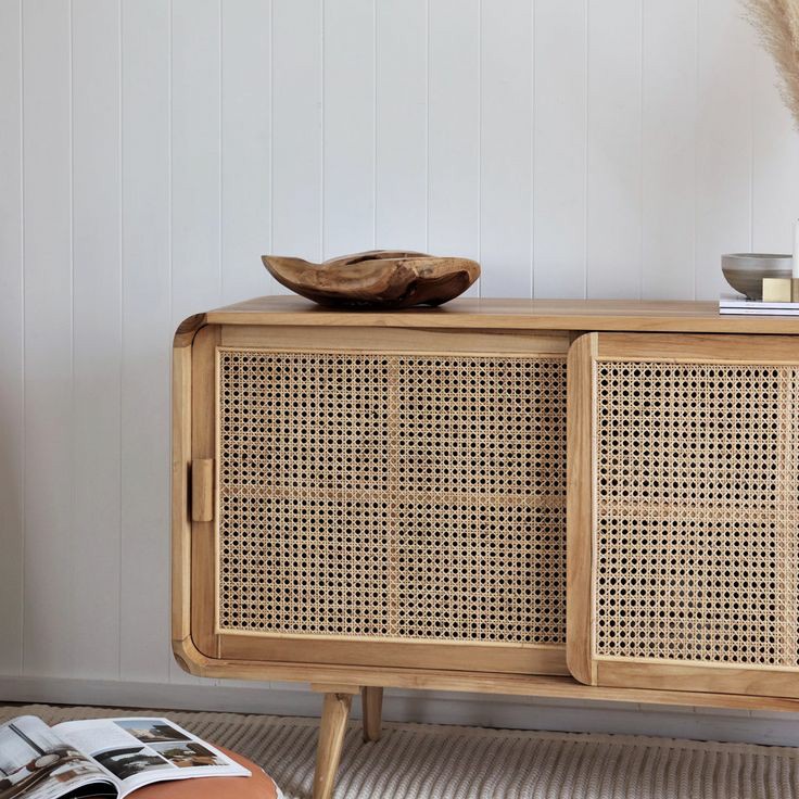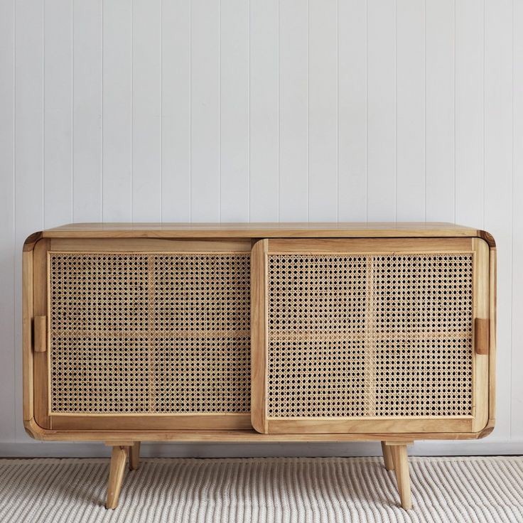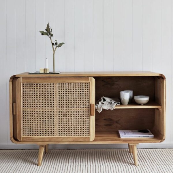 Handmade from hand woven rattan and solid wood, our Sideboard has two sliding doors and a middle shelf.