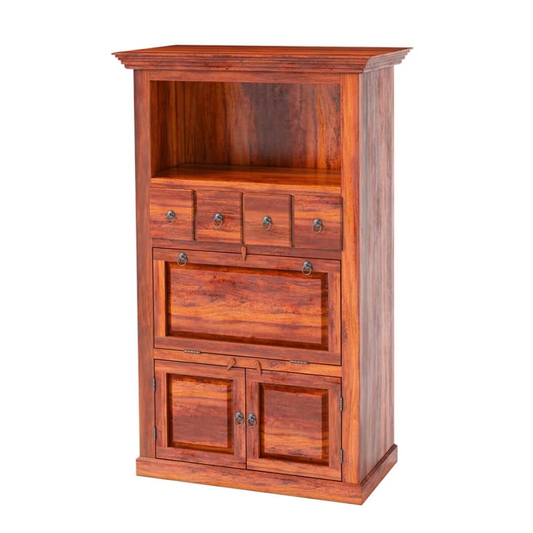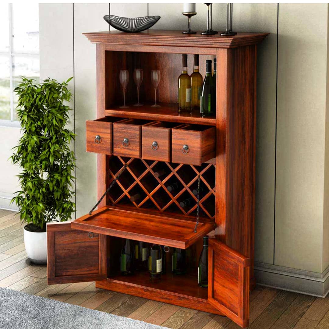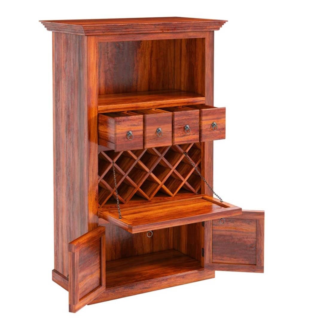 With Drop Down Wine Display Rack, Featuring a top shelf to keep decoratives and a counter shelf to mix the cocktails or pour the prized wines into glasses .