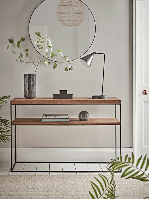 The Table has a simple geometric structure and has a combination of warm wood color surface and black metal frames. This shelf is designed for space saving and modern, stylish look. It can be placed in any room to provide additional storage space and aesthetic appeal to your home.