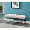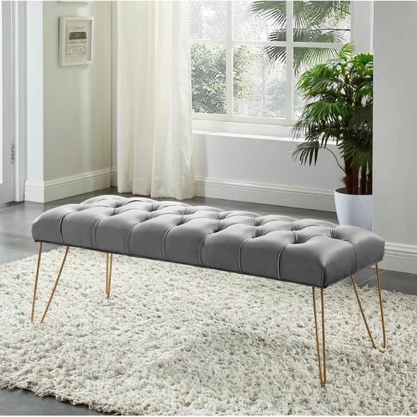 Inspired by the sculptural forms of Italian mid-century design, our Gold legs metal Bench balances elegant curves with a thick cushion seat. Its  tufted seat makes it ideal for at the foot of a bed or next to a window.