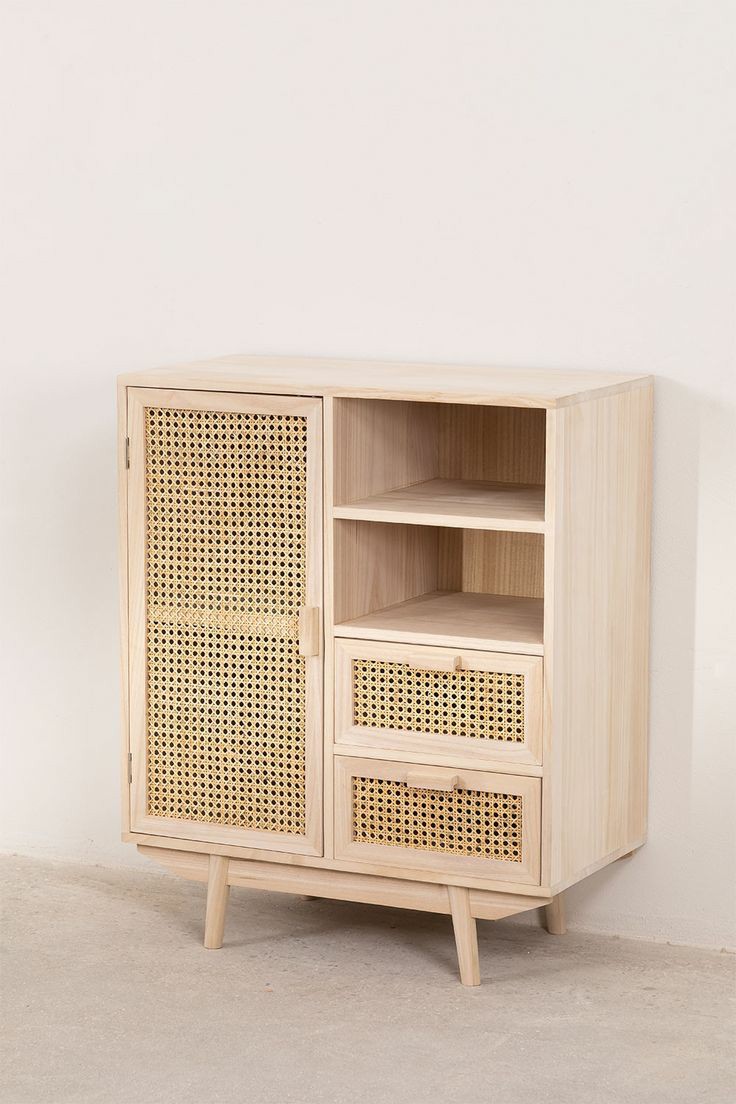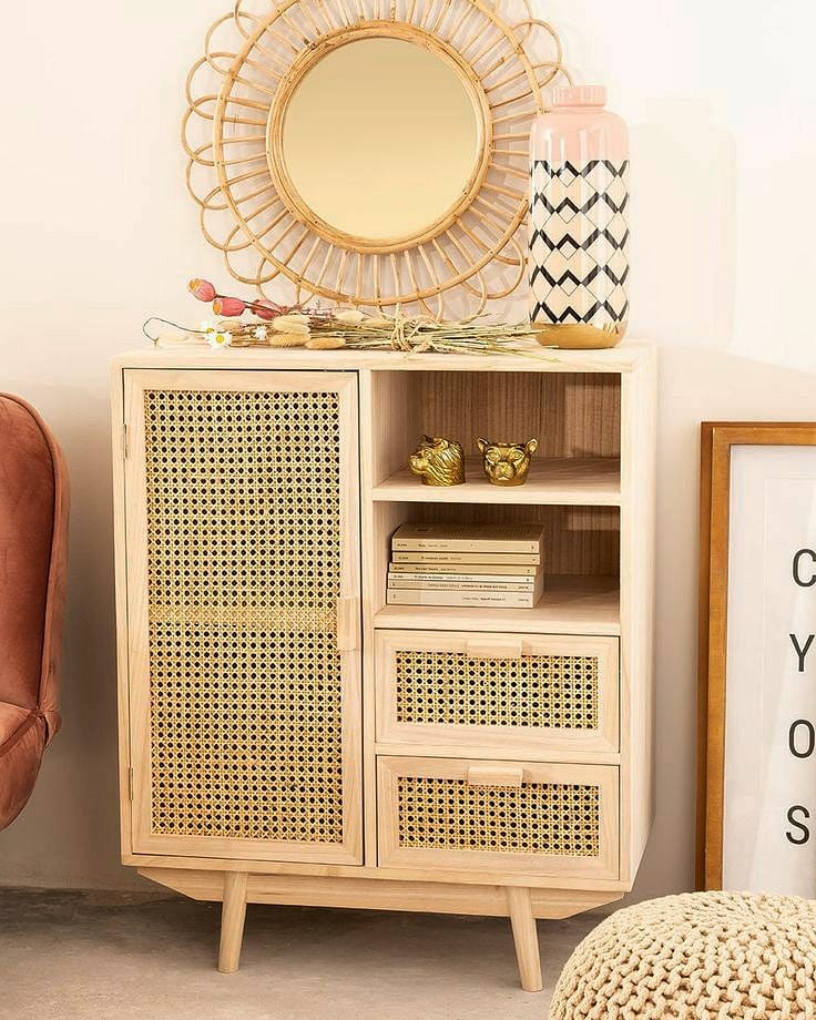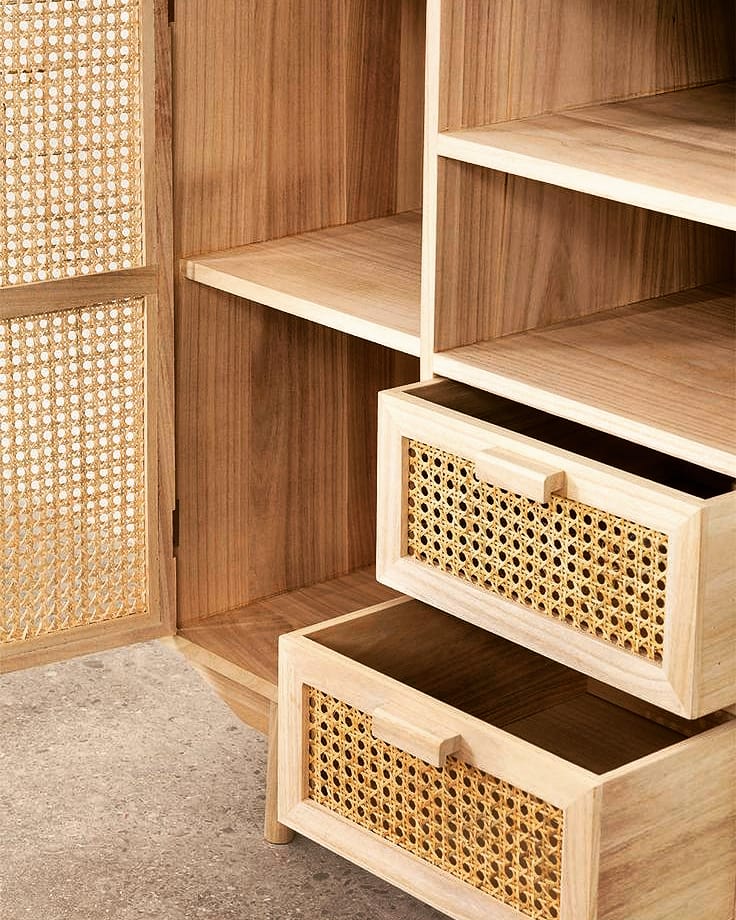 Our Wooden Sideboard with Wicker Drawers is designed following the latest trends in interior decoration, fusing a careful vintage-style design with wicker details with a robust and resistant structure in solid wood.