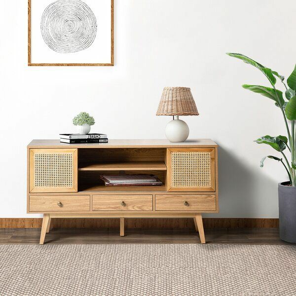 We love the rattan panes inset into the doors that give this piece a retro vibe allowing you to keep your essentials handy and out of sight. Its sliding canne panels makes it super stylish and unique
