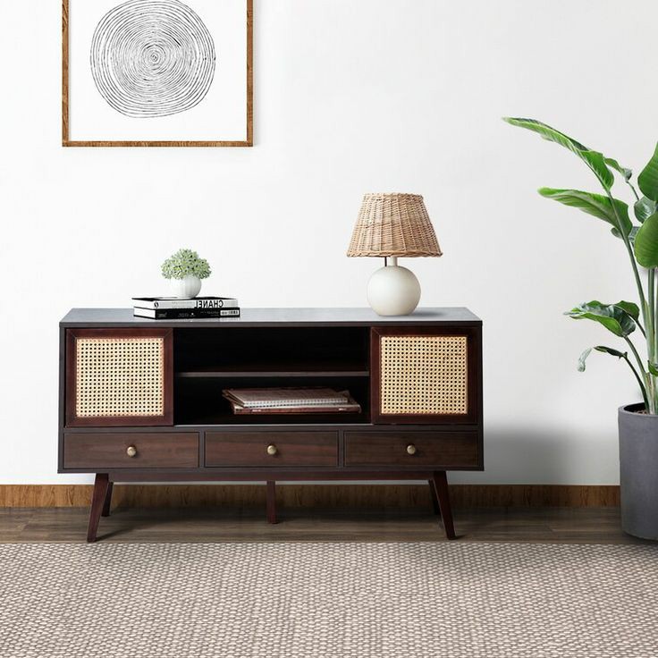 We love the rattan panes inset into the doors that give this piece a retro vibe allowing you to keep your essentials handy and out of sight. Its sliding canne panels makes it super stylish and unique