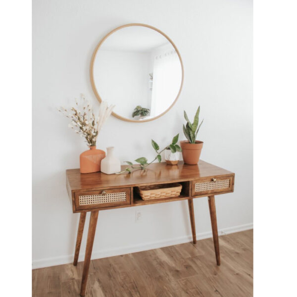 Constructed in solid wood,this hand crafted table has 2 pull out drawers and one open cabinet to provide you space to keep all your stationery items handy.