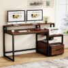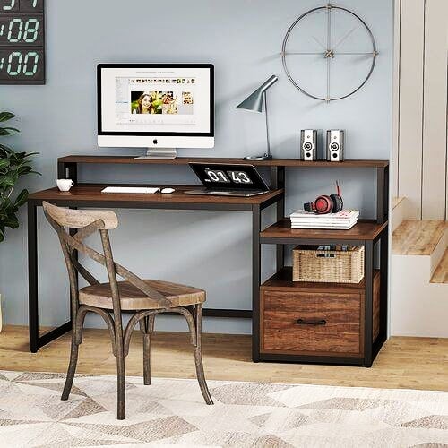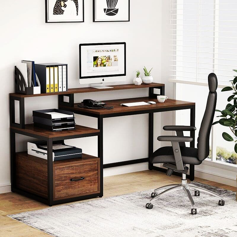 2-tier open shelves provide large storage for office essentials and reduce tabletop clutter! Bottom drawer is designed to hang LETTER size file folders and extends fully for easy access.