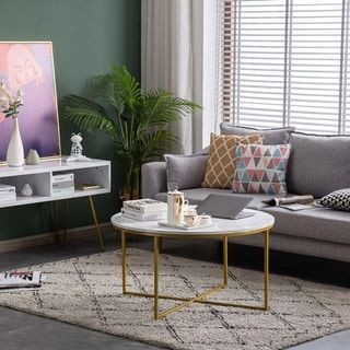 The coffee table will add a pleasing focal point to your space. The piece is topped with shiney marble and features a cross base legs, a shape that has both clean lines and a classic design.