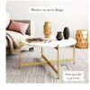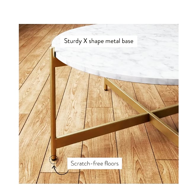 The coffee table will add a pleasing focal point to your space. The piece is topped with shiney marble and features a criss-cross base legs, a shape that has both clean lines and a classic design.